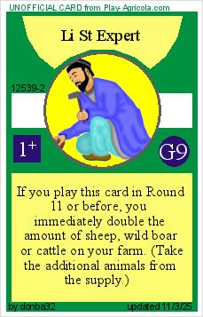 | 5 [View] | G9 | occ-1 | Li St Expert | If you play this card in Round 11 or before, you immediately double the amount of sheep, wild boar or cattle on your farm. (Take the additional animals from the supply.) | 0 | donba32 | +0 0Y,0N [Vote Yes] [Vote No] | [0 Comments] Add one. | ||