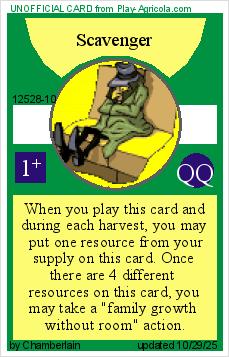 | 6 [View] | occ-1 | Scavenger | When you play this card and during each harvest, you may put one resource from your supply on this card. Once there are 4 different resources on this card, you may take a "family growth without room" action. | 0 | chamberlain | +0 0Y,0N [Vote Yes] [Vote No] | [0 Comments] Add one. | |||